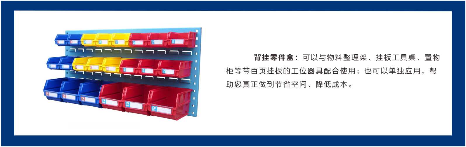 | 1.背掛零件盒的庫存產(chǎn)品為藍色、紅色和黃色,最低起訂量1個包裝箱。也可以定制綠、黑、灰等其他顏色,最低起訂量500只。 |